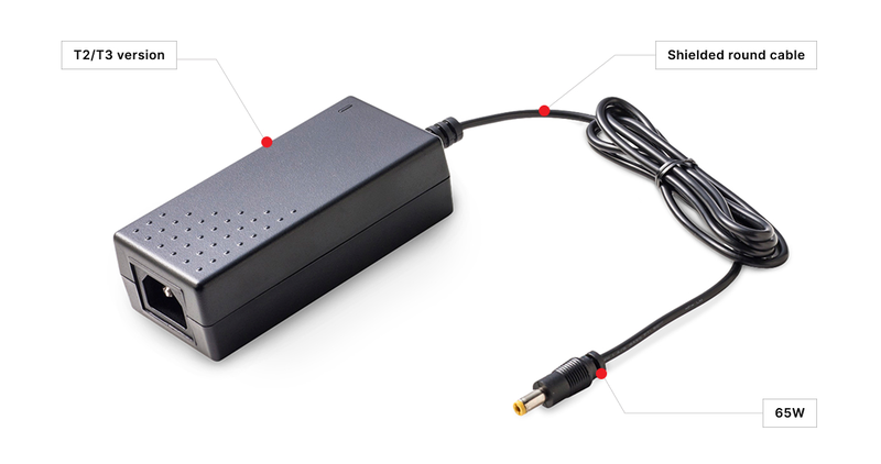 Desktop power supplies with AC input T2, input voltage 90-264V, output voltage 12-24V, power 36W. Connector 2.1x5.5, cable length 1.4m. Suitable power cord: IEC 320 C13 „PC cable“.