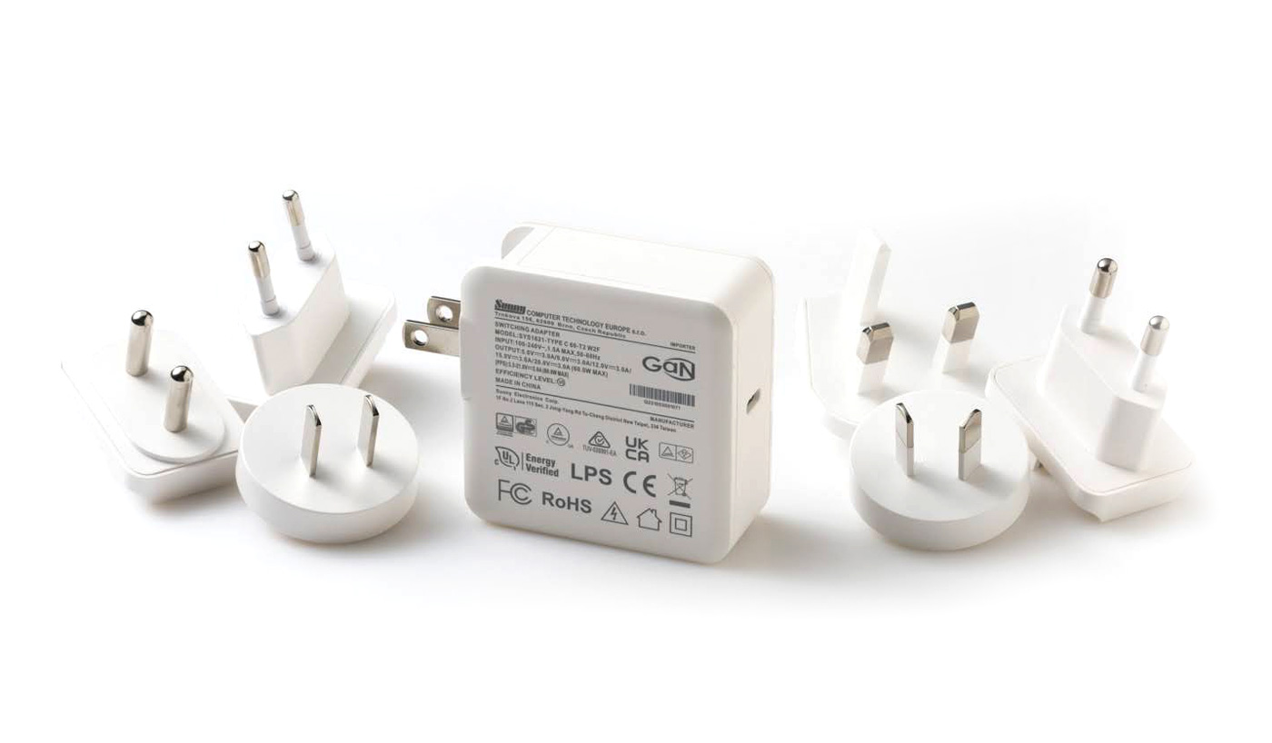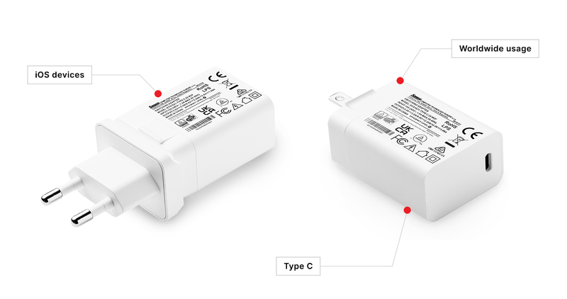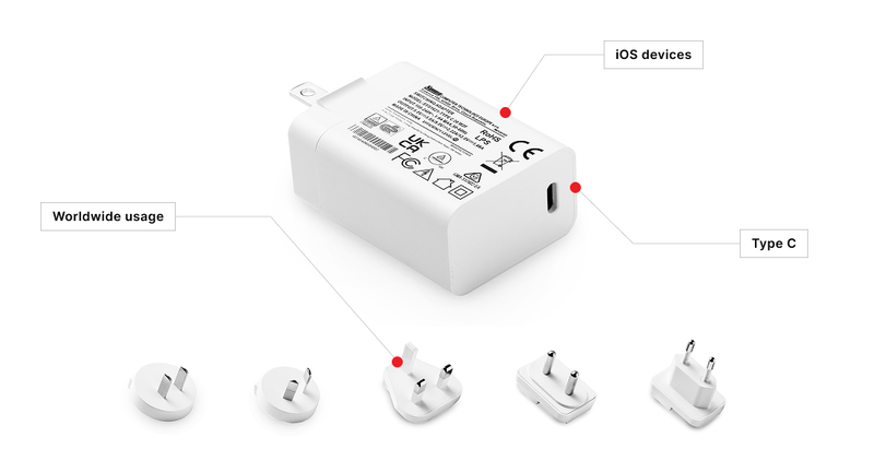 Switching wall mount power supply for Europe, USA/China, England, Australia, Argentina, Korea and India(W2E, W2, W3U, W2A, W2G, W2K, W2I, W2C plugs). USB-C Power delivery.
