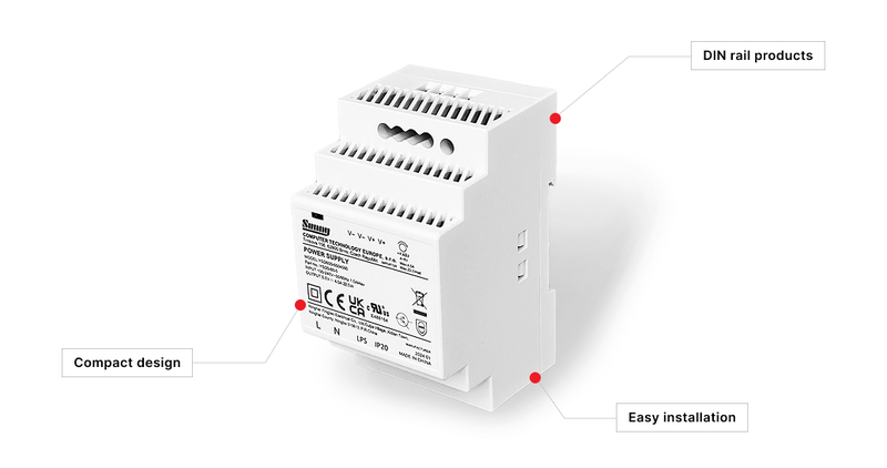 A wide range of power supplies for mounting on a DIN rail.