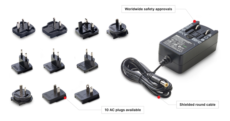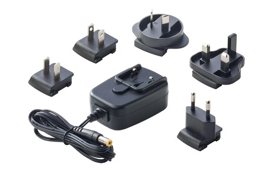 Switching wall mount power supplies (changeable AC plugs). Separately connectable plugs for Europe (W2E), G. Britain (W3U), USA, Canada, Japan, Taiwan (W2), Australia (W2A), China (W2C) and Korea (W2K). Connectors 2.1x5.5, cable length 1.4m.